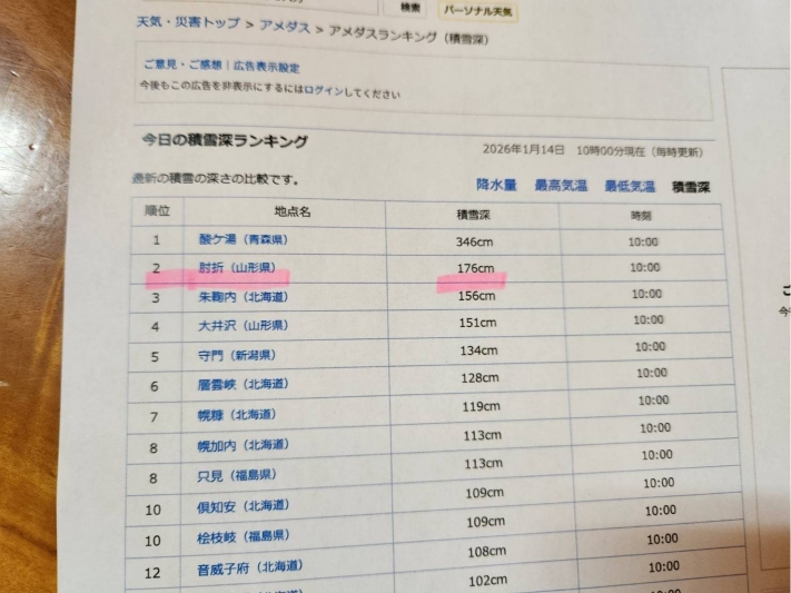 ★1/14(水)10時発表<積雪ランキング全国第2位肘折176センチ>★さあ わっくわくの冬デス♪