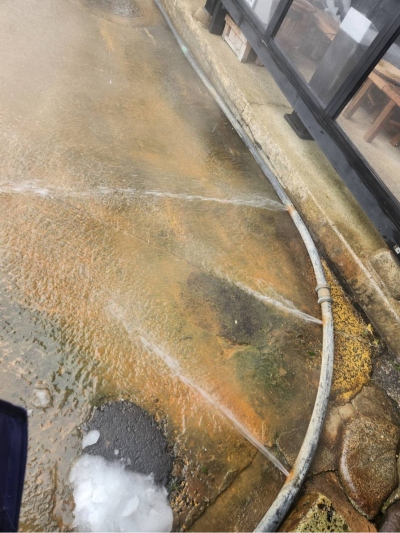 こちら↓は元河原湯玄関前・・・温泉場ならではの湯けむりの中<廃湯雪溶かし>作戦◎◎◎です。