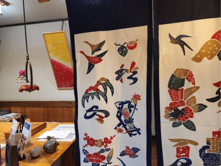 ロビー正面:<芹沢ケイスケ>の明るいのれん&浅草<ふじや>の春らしい手拭い額デス◎◎